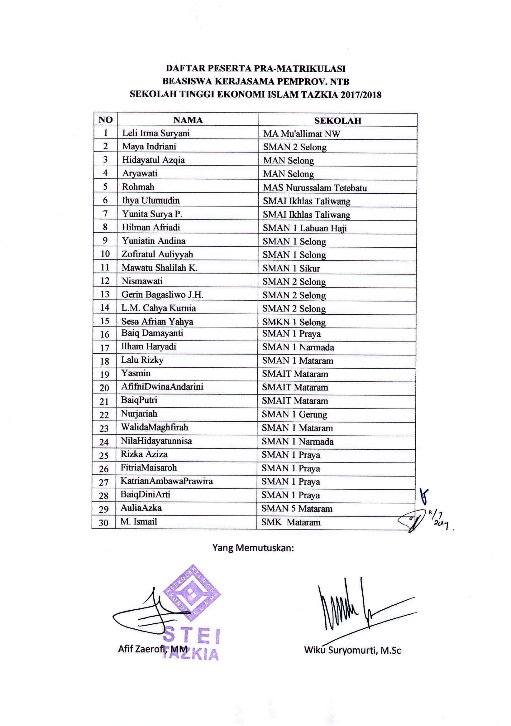 STEI Tazkia congratulates the names listed below who have been declared to pass an interview selection scholarship NTB Provincial Government - STEI Tazkia . The next process of the graduated participants is required to attend the quarantine program for 1 month on 20 July s.d 20 August 2017 in Mataram. The cost of quarantine is covered by the event organizer. Out of 30 quarantine participants will be selected the 20 best participants who are eligible to receive the scholarship.